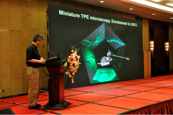 北京大学程和平院士回顾了荧光显微成像技术的发展历史和现状,着重介绍了其团队研制的新一代高速、高分辨、微型化双光子荧光显微镜,展示了最新显微成像设备获取的小鼠在自由行为过程中大脑神经元和神经突触活动清晰、稳定的图像。微型化双光子荧光显微镜的体积小,重量轻(仅2.2克),适于佩戴在小动物头部颅窗上,实时记录数十个神经元、上千个神经突触的动态信号,为脑科学、人工智能的研究提供了重要的手段。